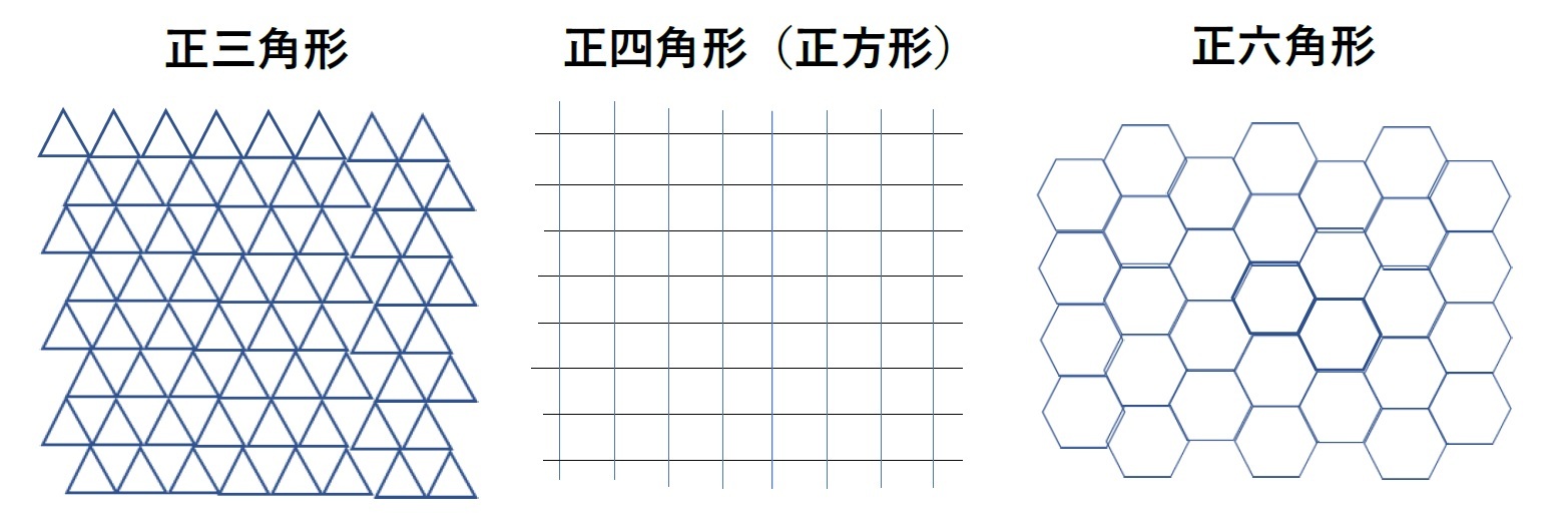 同じように、平面に同じ形状を並べることが可能な形は、三角形・四角形・六角形の3つしかありません。
